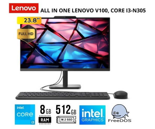 Computadora All-in-One Lenovo V100, Pantalla 23.8" FHD IPS Procesador Intel Core i3-N305 1.8GHz Memoria RAM 8GB DDR4-3200MHzDisco Sólido 512GB SSD M.2 PCIe NVMe, Video: Integrada Intel UHD Graphics, LAN GbE (RJ-45) / WLAN Wi-Fi 6 802.11ax (2x2) / Bluetooth 5.2, Audio: HD / Parlantes: 2Wx2, Camara Web HD / Microfono Mono, Teclado USB Mouse USB Pantalla Antirreflejante/250nits/99% sRGB, Color Negro, Adaptador de poder de 65W, FREE DOS.